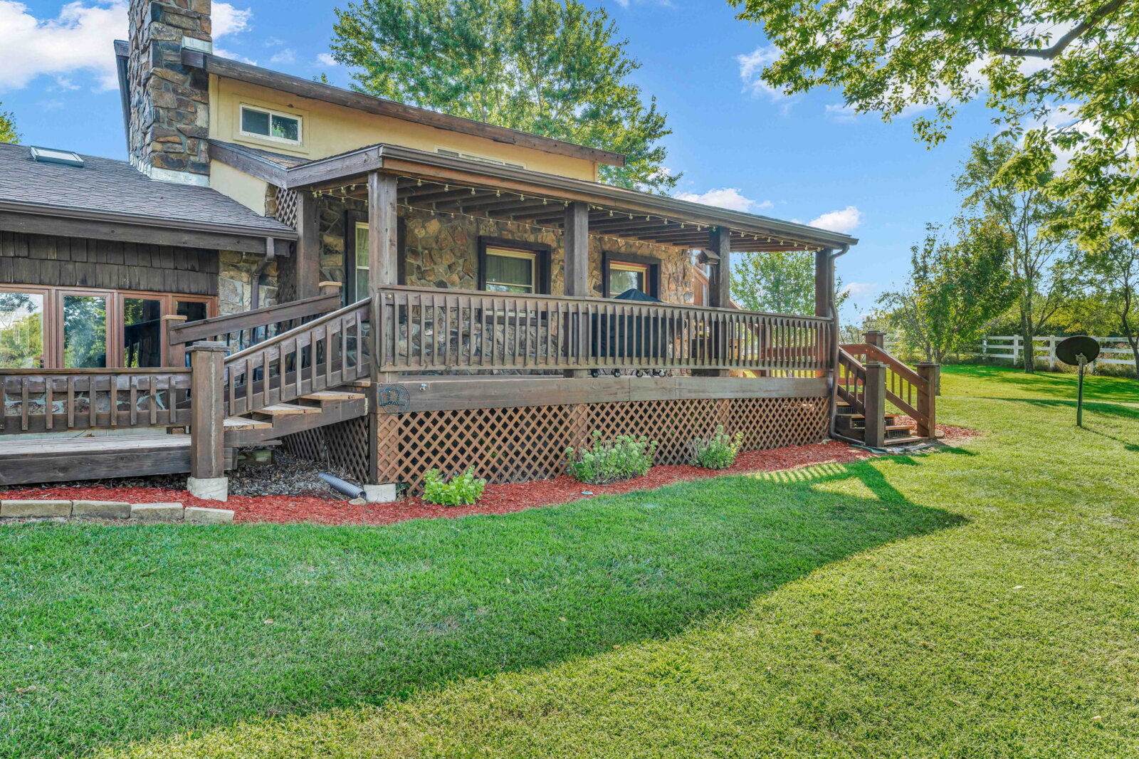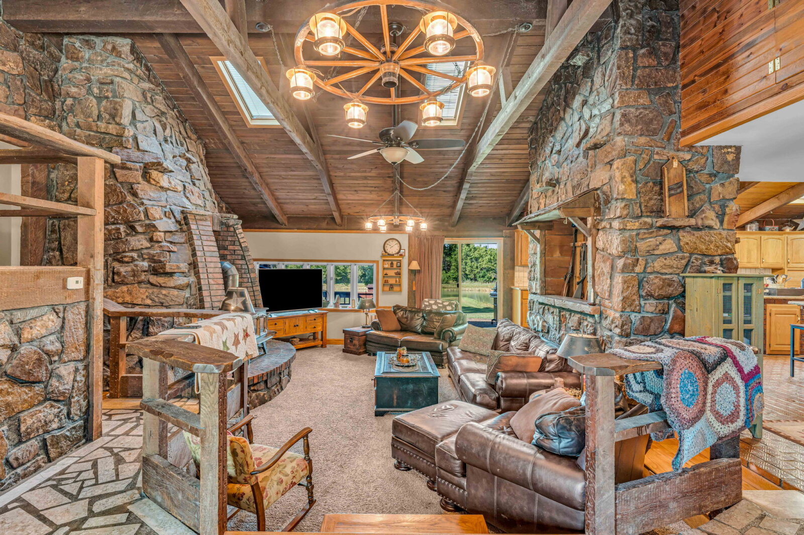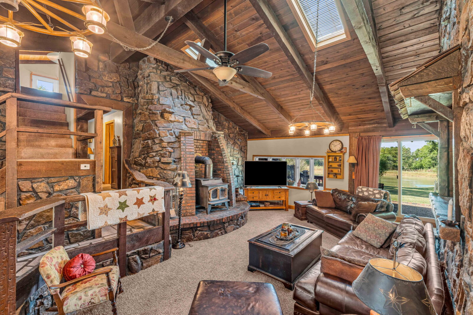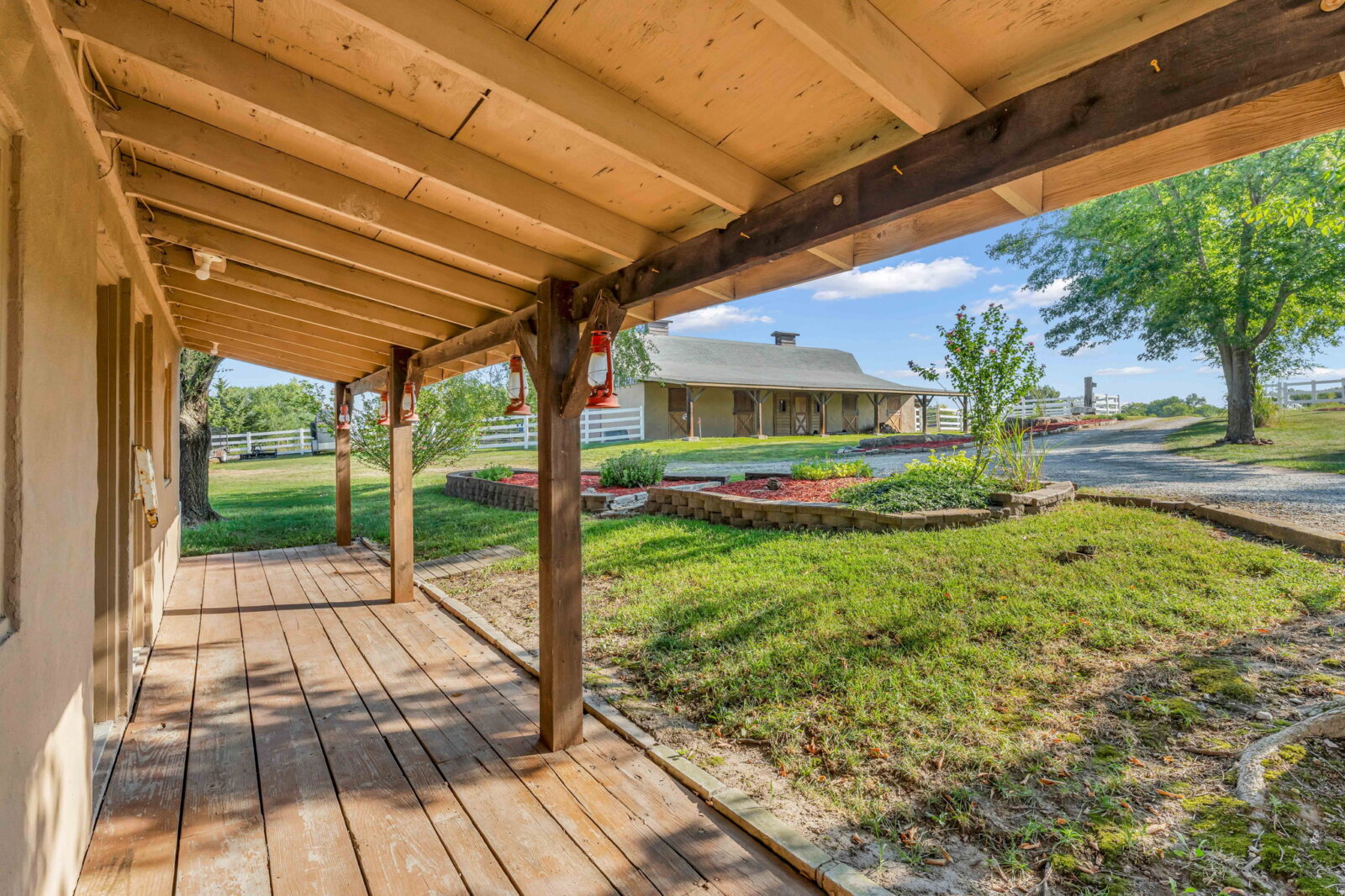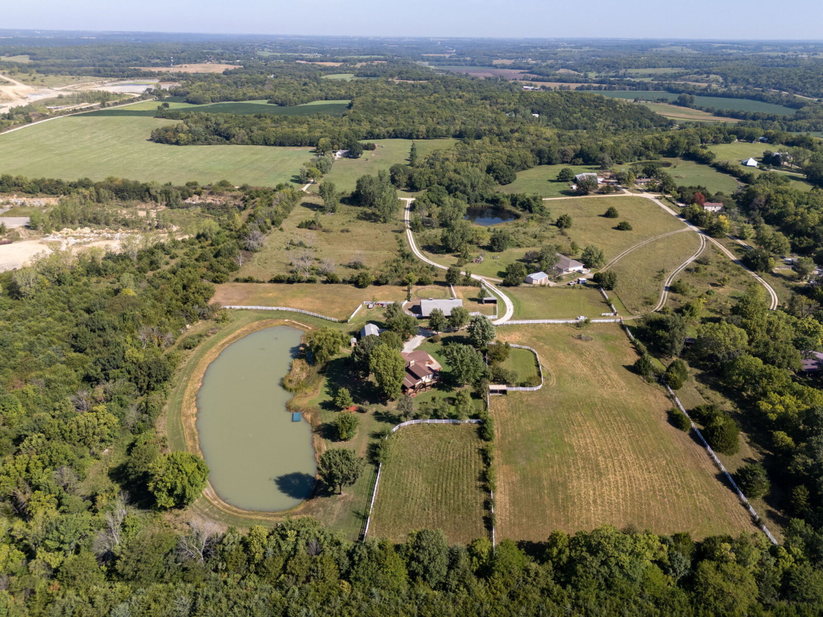 Yellowstone Ranch on the prairie! R&R awaits you! This custom built 4 bedroom, 2 bath home & equine property on nearly 10 acres is a picturesque retreat in rural Jefferson County, complete with one of a kind masonry features throughout the main living space, including a marble entry from the Topeka Capitol Building. The heart of the home is the large kitchen with additional spacious dining space and the family room with beautiful views overlooking the property and a wood-burning stove. The basement features an additional fireplace and storm shelter. Sip your coffee, watch the sunsets or star gaze on the home’s main level and master suite decks! Watch wildlife or go fishing on your nearly 2 acre aerated & stocked pond. Harvest fruit from your orchard which hosts a variety of fruit trees or hunt on your private property – a true outdoor paradise! The expanse of the property is a horse lover’s dream – with a well-appointed 6 stall horse barn including a brick & block tack room, 2 breakdowns and 1 foaling stall, brick-overlayed interior posts & arches, and large electric garage doors. Storybook white fencing with cross-fencing to 5 pastures and a hay field. In addition to the homes attached garage, an additional oversized detached garage features a workshop & hobby areas with plenty of storage for your ranch endeavors. Cameras on premises. Welcome home to your slice of country living dreams!