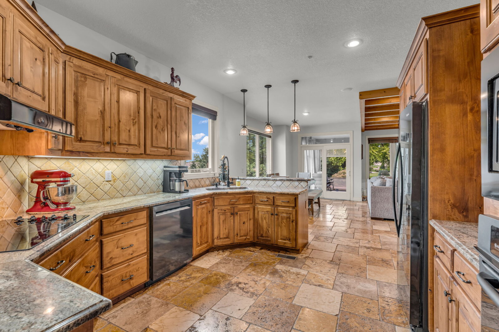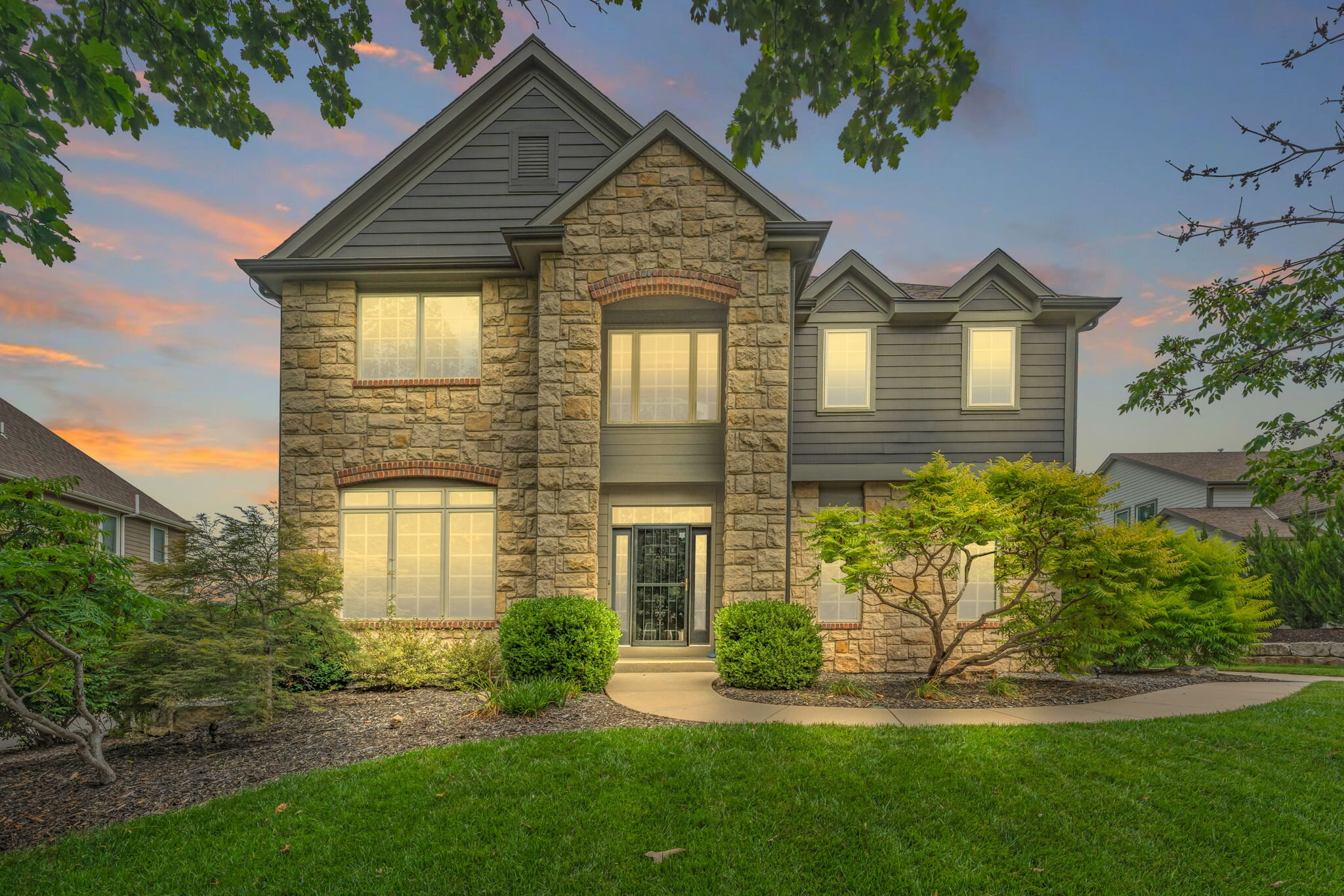 Beautiful & spacious 5 bedroom, 5 bath home located in West Lawrence’s beautiful Westwood Hills community. Situated on a cul-de-sac with a side entry 3-car garage, this stunning home offers 3 levels of intentional living for everyday relaxing and entertaining guests at various venues throughout the property. The grand entry features a marvelous 2-story staircase offset by a formal living room & dining room. Ornate millwork, elegant design and high-quality materials can be seen throughout. The heart of the home is the Great Room featuring an inset tongue and groove ceiling, an additional fireplace and dining area. Custom alder cabinetry throughout the kitchen contrasts natural-toned tiles and solid surface countertops. The laundry/mudroom & half bath are also included in the main level. A favorite feature of the home, you’ll find a screened in porch – perfect for evening conversations, dinner with guests or enjoying morning coffee. Step further outside and take in the yoga deck, tranquil water fountain, zen garden, hot tub, large patio seating area, firepit in the backyard with an access to nearby trails and basketball hoop. The upper level provides an expansive in-home retreat highlighted by detailed trim work, a luxury hotel-escape primary bedroom complete with en suite- walk-in shower, walk-in closet and soaking tub. Wake up everyday and feel like you’re on vacation! 3 additional bedrooms, a bonus room and 2 additional bathrooms are included on the upper level as well as a multipurpose lounge area and catwalk connecting both sides. The home’s lower level features additional entertaining zones: a large family room with back lit wet bar – including a fridge, ice maker, kegerator and dishwasher, a media room with theater style components ideal for GAME DAY or movie nights, additional storage, a 5th bedroom/guest suite and 3/4 bath. With expansive square footage there is versatility throughout the home to re-imagine the use of various spaces to maximize personalized living on Inge Ct! Enjoy the beautiful private neighborhood pool with owner-issued access. Prime location with nearby access to Rock Chalk Park, nature trails, Sports Pavilion Lawrence, KU Athletics facilities, LMH West, dining, and K-10/I-70. Welcome HOME!